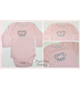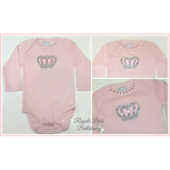 Tutina Body colore rosa 100% Cotone, raffinata con luminosi strass + deliziosa coroncina centrale. Adatta a Bimbi Neonati di 6 Mesi (Lunghezza 63-69 centimetri). Manica Lunga. Apribile in basso con 3 bottoncini per apertura/chiusura body e per facilitare cambio pannolino. Personalizzata nei nostri laboratori di decoro. Pezzo Unico.