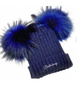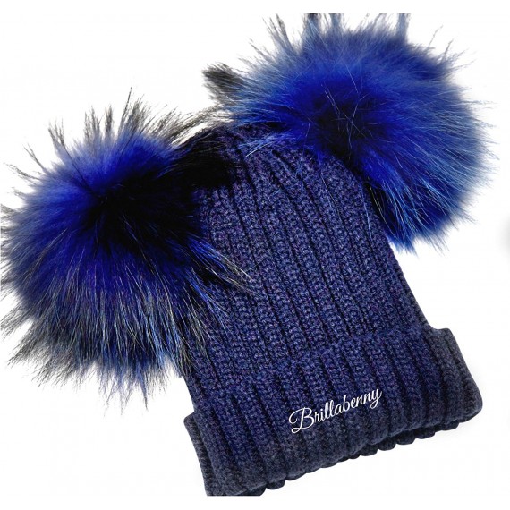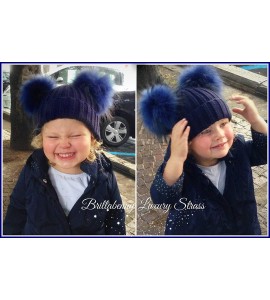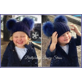 BrillaBenny Cappello Blu Navy PON PON Doppio Vera Pelliccia (12 Mesi - 3 Anni) Cuffia Bimba Cappellino Baby Hat Fur Kids Double
