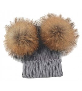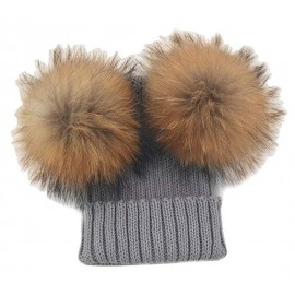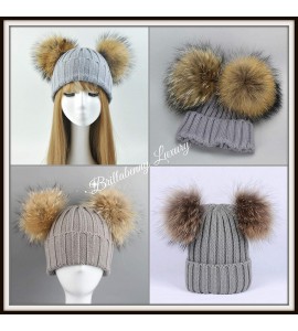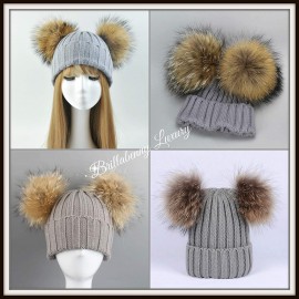 BrillaBenny Cappello PON PON Doppio Grigio con Pelliccia Beige Naturale (Ragazza, Ragazzina, Donna, Kids, Adulto) Cappellino Uni