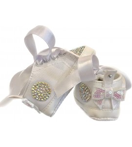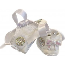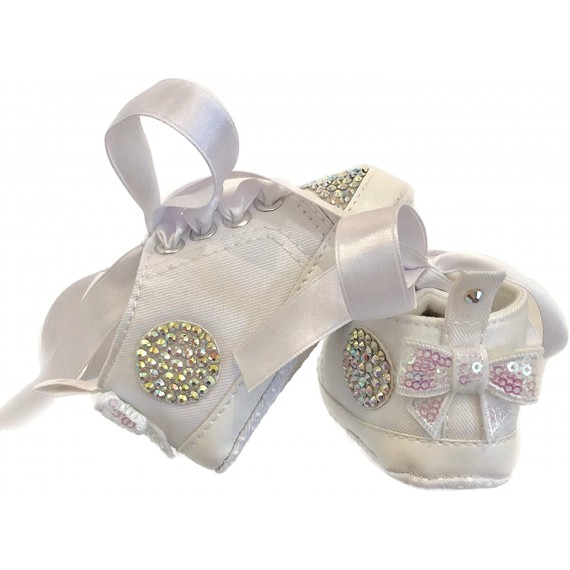 Scarpine Sneakers eleganti di colore bianco, suola in morbida stoffa (x neonati da culla), personalizzate sulla punta con luminosi cristalli aurora boreale, fiocchi sul retro tallone e nastri in doppio italiano bianco. Le scarpine hanno punta ampia e sono adatte a piedini con caviglia larga. Sono Handmade, decorate a mano dai nostri laboratori con i migliori cristalli boreali e con colle atossiche. Misurare il piedino del bebè in centimetri prima dell'acquisto in modo da assicurarsi la giusta taglia. Ottime anche come Regalo. L'articolo può essere restituito, ma le spese di andata e ritorno sono a carico del cliente. Prego osservare questa regola prima di ordinare o acquistare nel nostro shop :)
