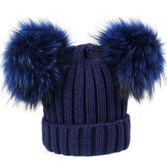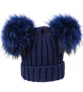 Cappellio Blu Navy misto lana unisex da 10 anni / Adulto 50-60cm con doppio pon pon a clip in vera pelliccia