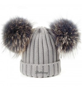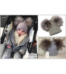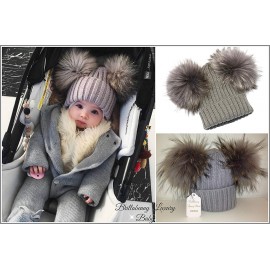BrillaBenny Cappello PON PON Doppio Staccabile in Vera Pelliccia Grigio Grey (1-4 Anni) Cappellino Hat Fur Baby Kids Double Poms