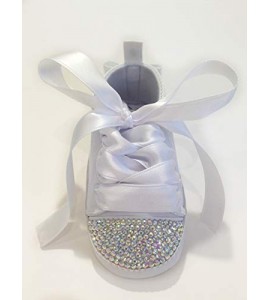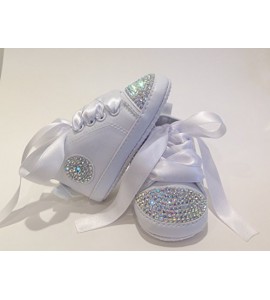 Scarpette eleganti colore bianco, suola in morbida stoffa, personalizzate con luminosi cristalli aurora boreale.
