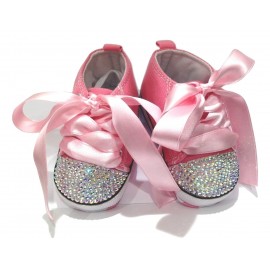 Scarpette eleganti colore rosa, suola in morbida stoffa, personalizzate con luminosi cristalli aurora boreale. Le scarpine hanno punta ampia e sono adatte a piedini con caviglia larga.