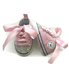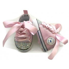 Scarpette modello Sneakers colore rosa suola in morbida stoffa, personalizzate con luminosi cristalli sulla punta aurora boreale. Taglie Disponibili: 0-3 Mesi (Lunghezza Suola Esterna 10cm) / 3-6 Mesi (Lunghezza Suola Esterna 10,5cm. Le Scarpine hanno punta ampia e sono adatte anche a piedini con caviglia larga.