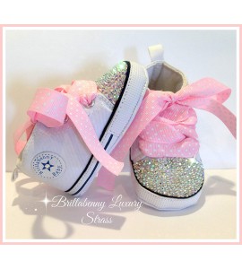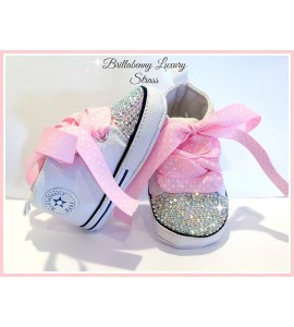 Scarpette eleganti colore bianco, suola in morbida stoffa, personalizzate con luminosi cristalli aurora boreale. Le scarpine hanno punta ampia e sono adatte a piedini con caviglia larga.