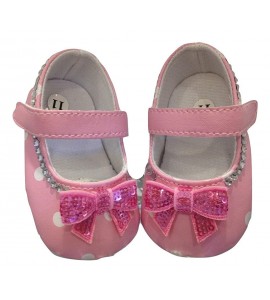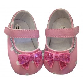 Scarpine Baby da culla rosa a pois bianchi, decorate con cristalli strass trasparenti e fiocchi pink. Tessuto simil pelle. Essendo decorate a mano dai nostri laboratori, sono possibili leggere variazioni relative alla disposizione delle pietre.