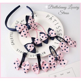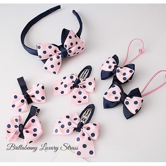 SET BIMBA 7 pezzi: 1 CERCHIETTO + 4 MOLLETTINE + 2 CODINI ELASTICI FIOCCO POIS ROSA BLU x CAPELLI Raso/Satin Festa Compleanno