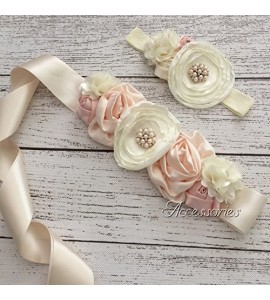 Set Fascia Baby Elastica + Cintura Panna Champagne e Salmone 4x180cm con Strass, Rose di raso in seta e Peonia centrale