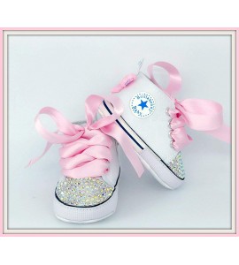 Scarpe Sneakers in tela da neonata 0-3 mesi bianca con cristalli strass e fiocco pailettes