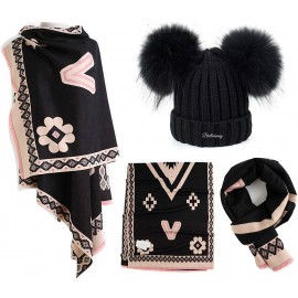 Sciarpa pashmina 190x70cm nero e rosa misto lana cashmere cappello con doppio pon pon a clip in vera pelliccia 50-60cm